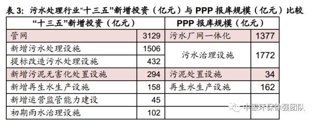 為了分析此次污水處理“十三五”規(guī)劃投資規(guī)模的超預(yù)期程度,我們將發(fā)改委發(fā)布的投資預(yù)測(cè)數(shù)據(jù),與財(cái)政部12.95萬(wàn)億PPP庫(kù)中的污水、再生水、管網(wǎng)、污泥類投資項(xiàng)目進(jìn)行一一比較,以考察污水處理板塊的相關(guān)需求,是否得到充分的市場(chǎng)預(yù)期。