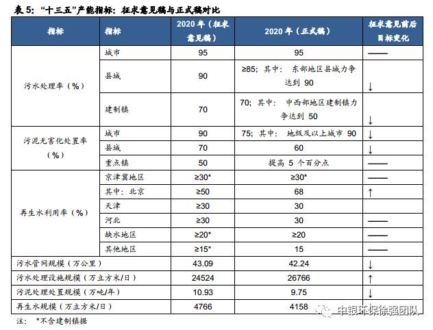 比較各項(xiàng)水處理產(chǎn)業(yè)鏈量化目標(biāo),在征求意見(jiàn)稿與正式稿之間的差別,可發(fā)現(xiàn)正式稿中將欠發(fā)達(dá)地區(qū)的標(biāo)準(zhǔn)合理小幅下調(diào),有利于提高政策的可執(zhí)行性,避免一刀切情況下帶來(lái)的政策不合理。