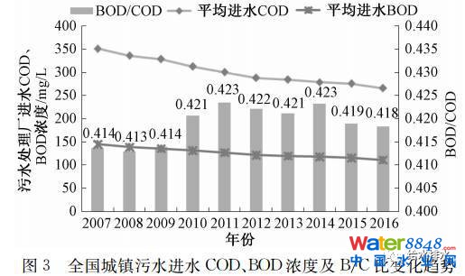 污水處理廠進(jìn)水COD濃度降低主要有幾個(gè)原因,一是污水處理廠的快速發(fā)展,管網(wǎng)系統(tǒng)仍普遍沿用原有的合流制管網(wǎng)甚至雨水管網(wǎng),這些管網(wǎng)許多建設(shè)于上個(gè)世紀(jì),甚至還有二三十年前建設(shè)的暗渠、排水溝等,年久失修現(xiàn)象不同程度存在,管網(wǎng)破損、錯(cuò)接、混接現(xiàn)象突出,雨水、地下水滲入,甚至還存在河水倒灌現(xiàn)象,導(dǎo)致污水收集的范圍越大、污水處理廠收集到的污水越“稀”;二是隨著經(jīng)濟(jì)發(fā)展和產(chǎn)業(yè)結(jié)構(gòu)調(diào)整,工業(yè)廢水進(jìn)入城鎮(zhèn)污水處理廠的比例減少,體現(xiàn)在BOD/COD的比值從2007~2011年略有增高(見圖3),之后基本穩(wěn)定在0.42左右,說明污水的可生化性趨好向穩(wěn),接近生活污水的可生化性。