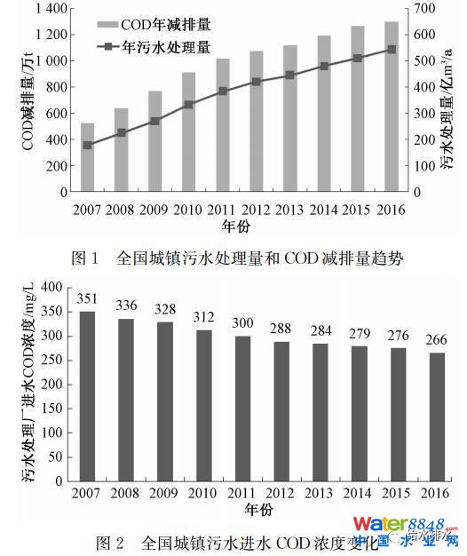 自2007年到2016年,十年間城鎮(zhèn)污水處理的規(guī)模由0.77億m3/d增長到1.77億m3/d,增長了130%,污水處理量由178億m3/年增長到542億m3/年,增長了204%,全年主要污染物減排量(以化學(xué)需氧量COD計(jì))由523萬t增長到1 300萬t,增長了148%,COD的減排量增幅滯后于污水處理量的增幅,說明單位污水處理規(guī)模的處理效能在下降(如圖1);從十年間的污水處理廠進(jìn)水COD濃度變化更能看出這一趨勢(如圖2),從2007年的351 mg/L下降到目前的266 mg/L,降幅達(dá)24%。