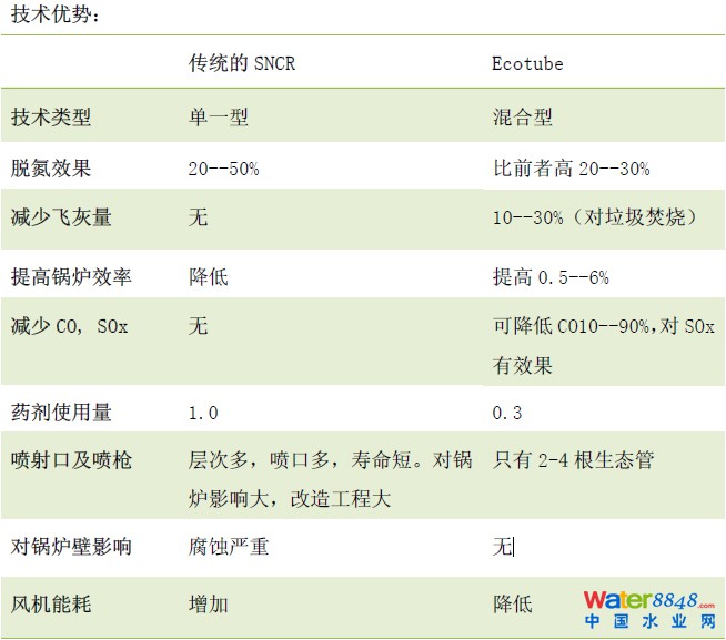 Ecotube 屬于低氮燃燒與煙氣脫硝技術(shù)相結(jié)合的技術(shù)類型,其技術(shù)特點(diǎn)如下:生態(tài)管系統(tǒng)是一種可改善燃燒工藝狀況,費(fèi)用-效益效果俱佳的工具,包括可收縮長槍(生態(tài)管),它帶有可注入試劑的噴嘴。不同的試劑可通過噴嘴在高的壓力和速度下導(dǎo)入燃燒爐。生態(tài)管被置于爐內(nèi)的關(guān)鍵的位置上注入試劑,造成與燃燒產(chǎn)物激烈的混合,導(dǎo)致燃?xì)庵纬赏耆旌系耐牧鳡顟B(tài)。另外,當(dāng)從生態(tài)管中噴入氨試劑時(shí)可以脫氮,當(dāng)噴入石灰時(shí),這個(gè)系統(tǒng)可以脫硫。