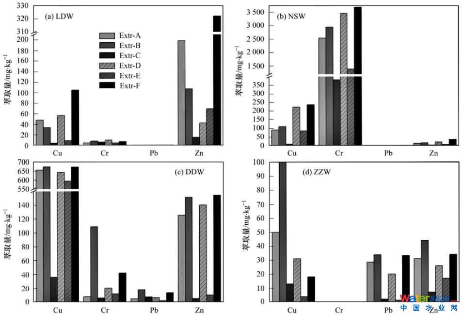 圖 1不同類型萃取劑對(duì)污泥中重金屬萃取量Fig.1Extraction concentrations of heavy metals in sewage sludge by different extractants |