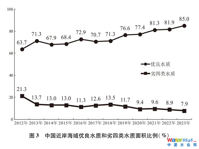 通過深入推進(jìn)重點(diǎn)海域綜合治理、陸海污染協(xié)同防治,持續(xù)建設(shè)美麗海灣,中國近岸海域水質(zhì)總體改善,2023年優(yōu)良水質(zhì)面積比例較2012年高出21.3個(gè)百分點(diǎn)。