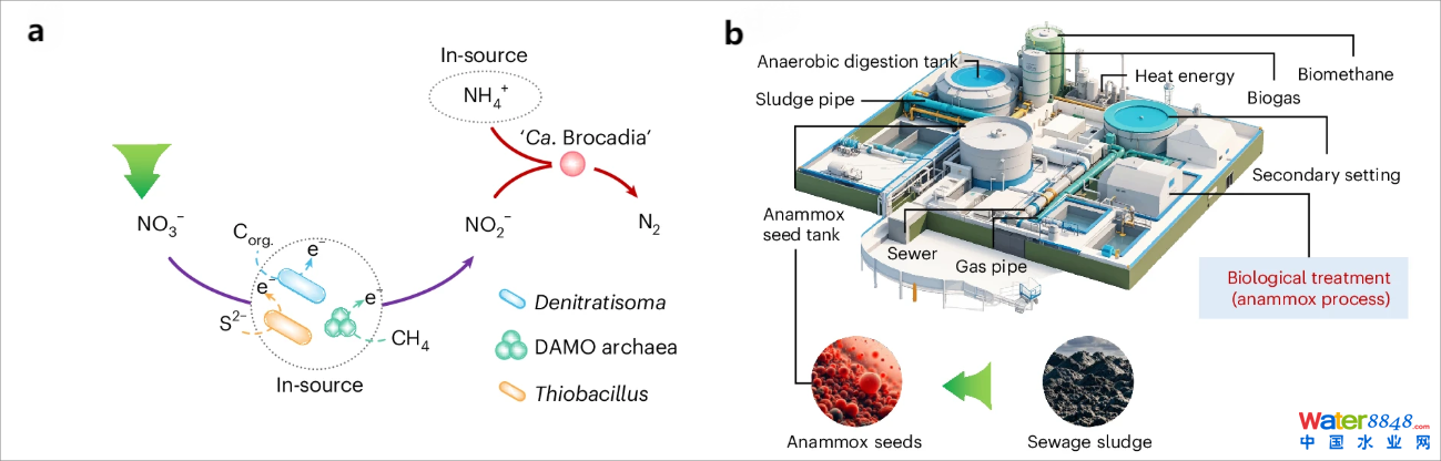 作者創(chuàng)新提出了一種硝酸鹽驅(qū)動(dòng)的原位氧化策略,充分利用污泥自身釋放的還原性物質(zhì)作為電子供體(碳、硫、甲烷和氨氮),誘導(dǎo)驅(qū)動(dòng)短程反硝化和厭氧氨氧化反應(yīng),繼而實(shí)現(xiàn)了厭氧氨氧化菌快速增殖。該策略為厭氧氨氧化種泥快速培育提供了一種高效、經(jīng)濟(jì)的新途徑,有力推進(jìn)了污泥資源化利用和污水低碳高效脫氮(圖4b),助力了污水處理行業(yè)減污降碳協(xié)同增效的目標(biāo)實(shí)現(xiàn)。
