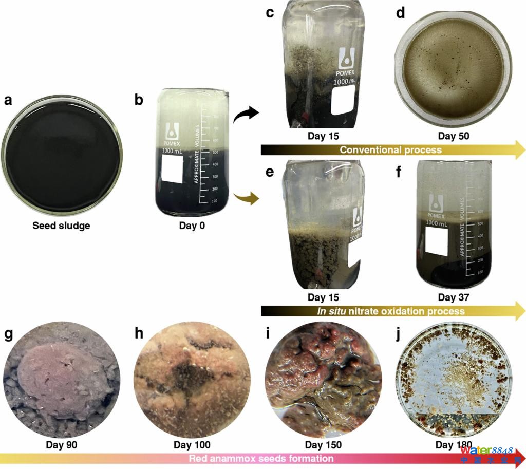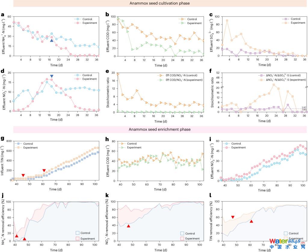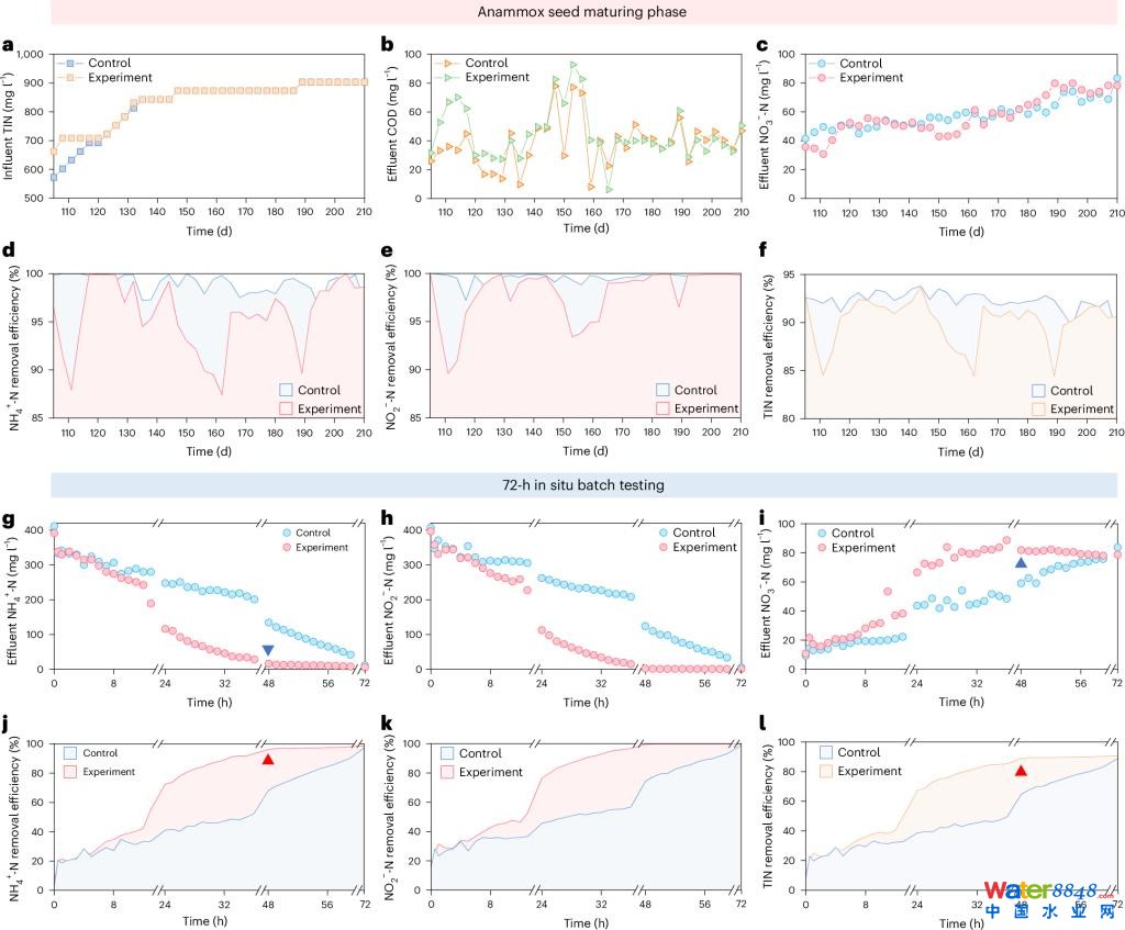 以污水廠厭氧消化污泥為研究對(duì)象,設(shè)置了實(shí)驗(yàn)組(前37天進(jìn)水僅添加硝酸鹽,后續(xù)進(jìn)水底物切換為銨鹽和亞硝酸鹽)和對(duì)照組(進(jìn)水為銨鹽和亞硝酸鹽反應(yīng)底物,全程未添加硝酸鹽)兩組反應(yīng)器。結(jié)果表明,實(shí)施該策略的實(shí)驗(yàn)組在1至15天觀察到明顯的亞硝酸鹽積累現(xiàn)象(圖1d),17天后出水銨鹽和亞硝酸鹽開(kāi)始同步降低,表明發(fā)生明顯的厭氧氨氧化反應(yīng)(圖1a,d),而對(duì)照組在47天后才出現(xiàn)明顯的厭氧氨氧化反應(yīng)(圖1j,k)。隨后,實(shí)驗(yàn)組中觀察到厭氧氨氧化種泥在三個(gè)月內(nèi)形成(圖3g),并快速發(fā)育為成熟的厭氧氨氧化污泥(圖3h,i,j),而對(duì)照組中未觀察到明顯的厭氧氨氧化種泥形成。穩(wěn)定運(yùn)行200天后,實(shí)驗(yàn)組和對(duì)照組平均總氮去除率均可達(dá)到90%以上(圖2f),而72小時(shí)沿程實(shí)驗(yàn)結(jié)果表明,實(shí)驗(yàn)組總氮去除速率(kg/m3/d)較對(duì)照組提升70%(圖2l)。