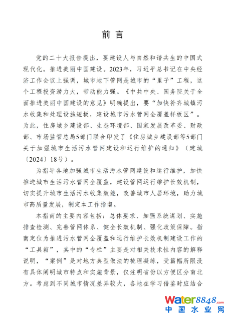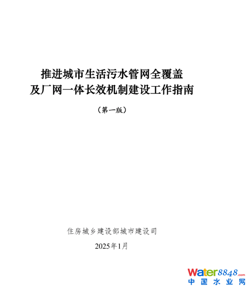 為落實黨中央、國務院有關工作部署,加快推進城市生活污水管網全覆蓋,建立健全污水管網建設運維長效機制,切實提升城市生活污水收集效能,我們組織編制了《推進城市生活污水管網全覆蓋及廠網一體長效機制建設工作指南(第一版)》,現印發(fā)給你們,請結合實際參照執(zhí)行。